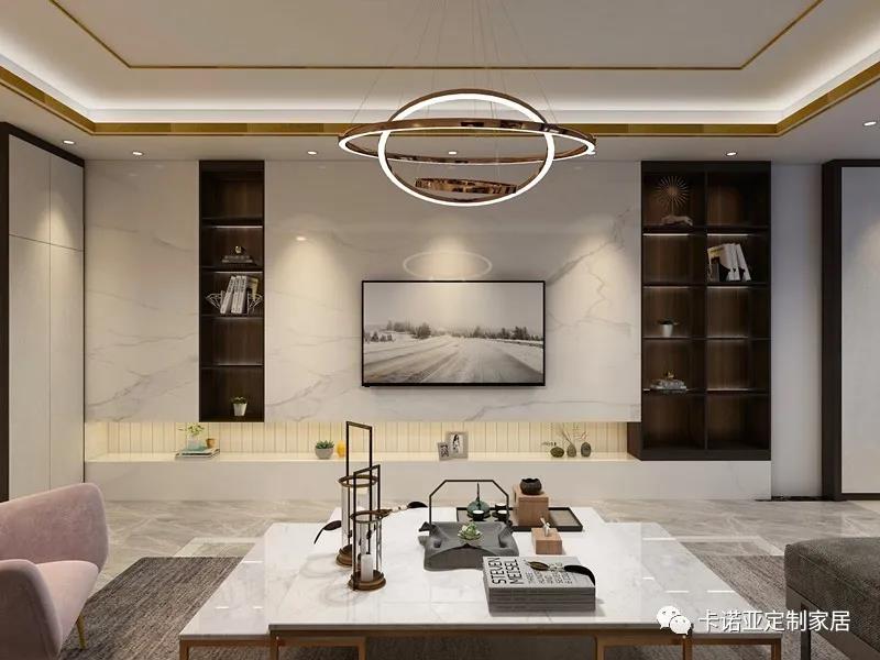 開放格入墻式電視柜造型簡(jiǎn)潔,和一旁的黑色木門相互呼應(yīng)。電視機(jī)下面的鏤空設(shè)計(jì),擺放藝術(shù)飾品,墻內(nèi)燈帶設(shè)計(jì),讓極簡(jiǎn)空間明亮而溫暖