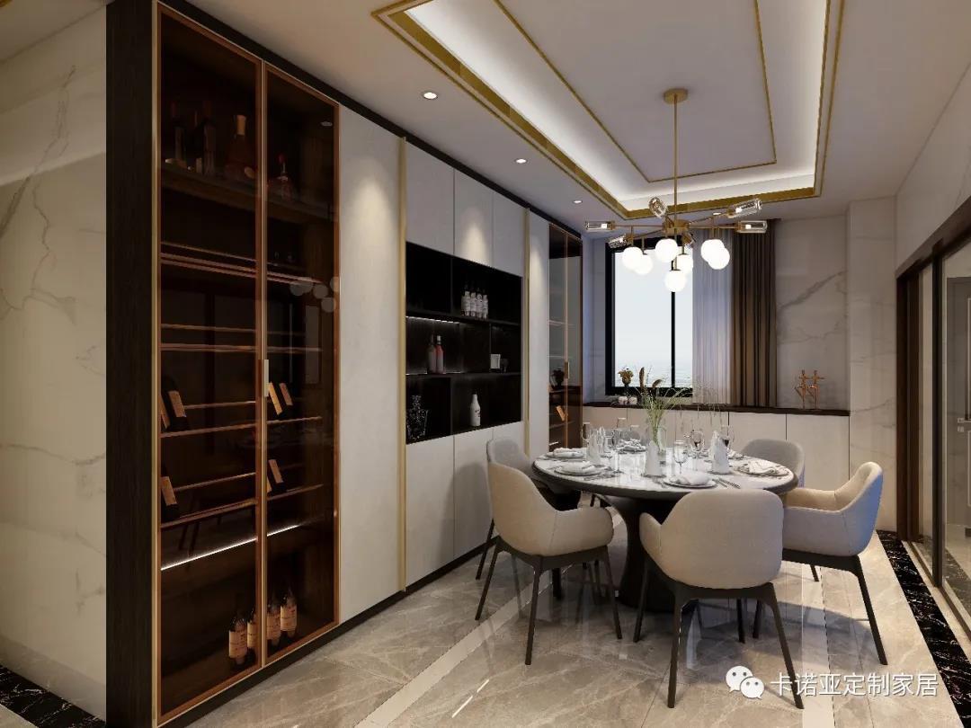 首先,將廚房擴(kuò)大改成玻璃推門增加自然光,其次利用窄墻做對(duì)稱式入墻多功能餐邊柜,
