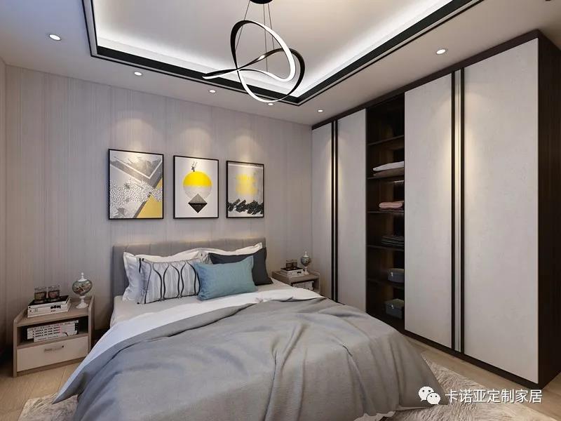 主臥選用了入墻式的開門衣柜,容量大,造型美觀整體。淡灰色的墻面與床品的灰色系呼應(yīng)整體的黑白色調(diào),