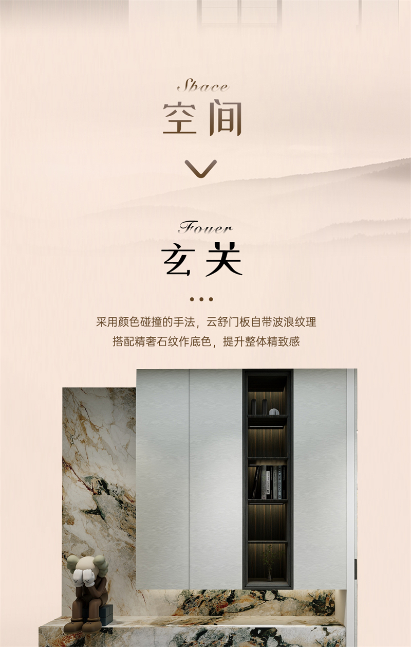 借助云水紋的元素,通過流動的線條,波動的紋理和現(xiàn)代的設(shè)計手法,打造舒適、放松、愉悅的家居氛圍。