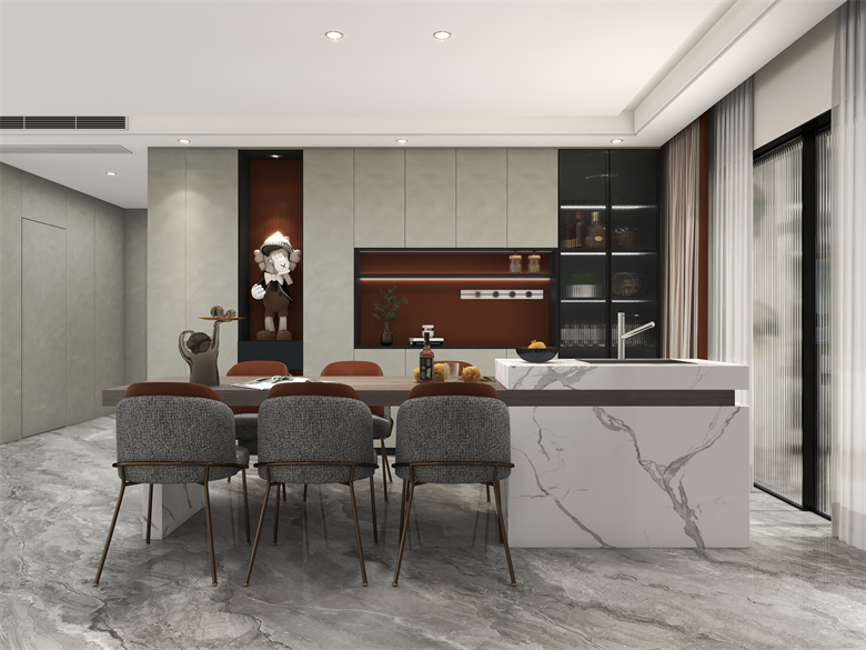 對于這套戶型的定義是實用的基礎上滿足業(yè)主時尚又年輕化的需求。整體空間從入戶到客餐廳都有一套強有力的流線進行引領。比如燈光的運用,材質的拼接和反光的處理都更好的表現了空間的質感和通透性。 空間的整體動線為業(yè)主更好的規(guī)劃了日常生活的走向,根據對業(yè)主年輕化和職業(yè)的分析,在設計中添加了手辦裝飾以及對職業(yè)需求的一些理解。