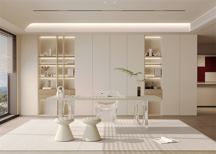4、書房:整個房間用調和后的暖白色打底,整墻書柜既有開放格及玻璃門,更有封閉柜,展示、收藏兼?zhèn)洹M该鞑馁|的桌腳與座椅,讓空間通透敞亮、淺淡平和,是妥妥的“C位擔當”。一株綠植,給溫潤通透的空間帶來活力。百葉窗遮光,顏值和實用兼顧。