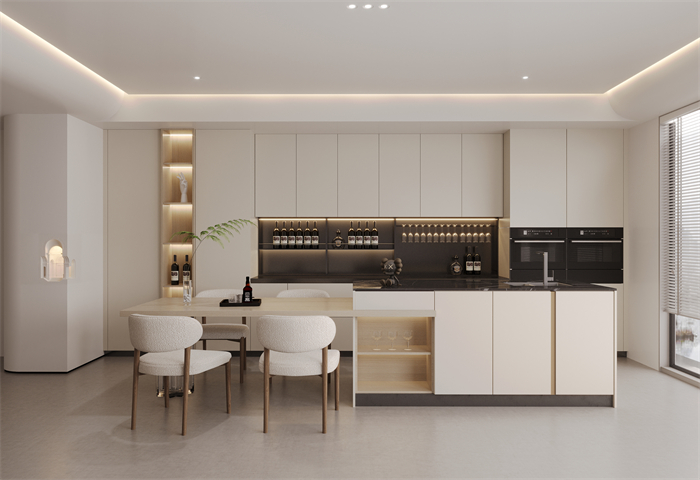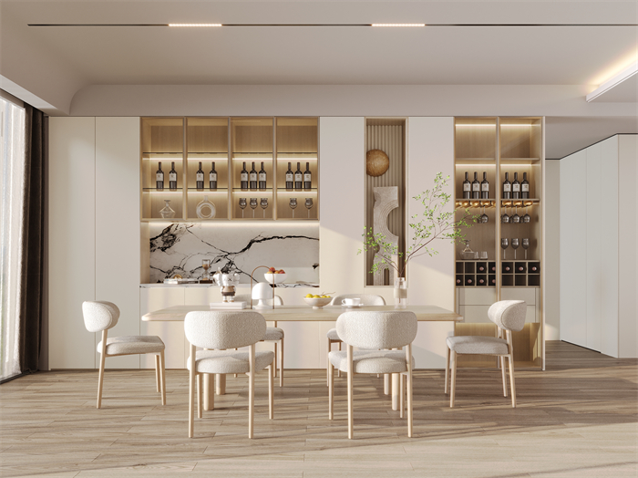 2、餐廳:純粹簡雅的奶油白配色,輕松營造愉悅的就餐氛圍。餐酒柜三段式設計,上半段帶玻璃門、燈帶,適用于展示美酒、飾品,加上凹槽處藝術3D掛畫,品味格調凸顯,高級感拉滿;中間鏤空處臺面,可用做收納、水吧臺、小電器等;下半段抽屜較多,收納更強。