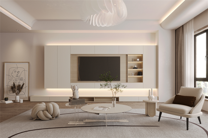 1、客廳:一眼望去,一股朦朧的奶白感拂面而來,頓時讓人卸下疲憊,心生平靜?;刈中坞娨暪瘢蛟煺麎κ占{,底部懸空設計加燈帶,輕盈時尚、自在舒適,營造暖和的氛圍感。