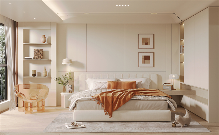 5、臥室:以奶油風白色調為主,床品、掛畫、座椅等跳躍色點綴,淡雅溫柔,仿佛為臥室加了一層柔光濾鏡。衣柜底部延伸出懸空床頭柜,一體設計更整體更省空間,一改傳統(tǒng)床頭柜的對稱設計。大落地窗設計,光線好的床頭一側定制辦公區(qū)和書柜,舒適兼多功能。