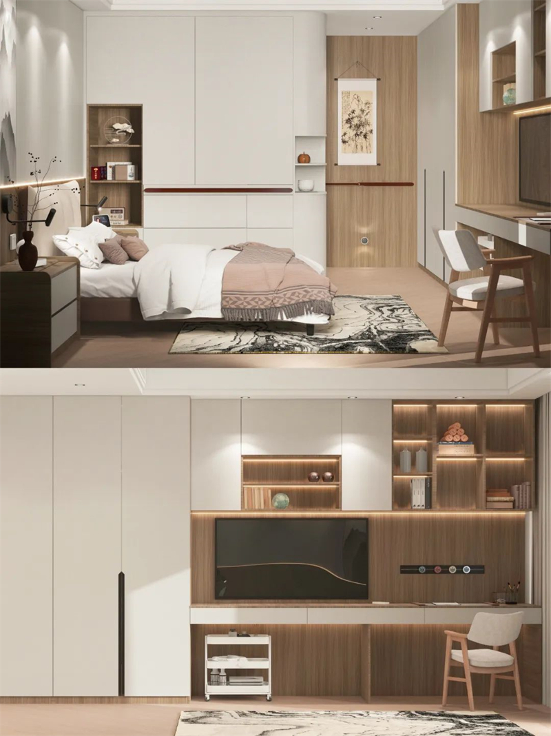 ??床尾選擇做衣柜+書桌柜一體化設(shè)計,看書、練書法、看電視,在家悠閑樂享時光?