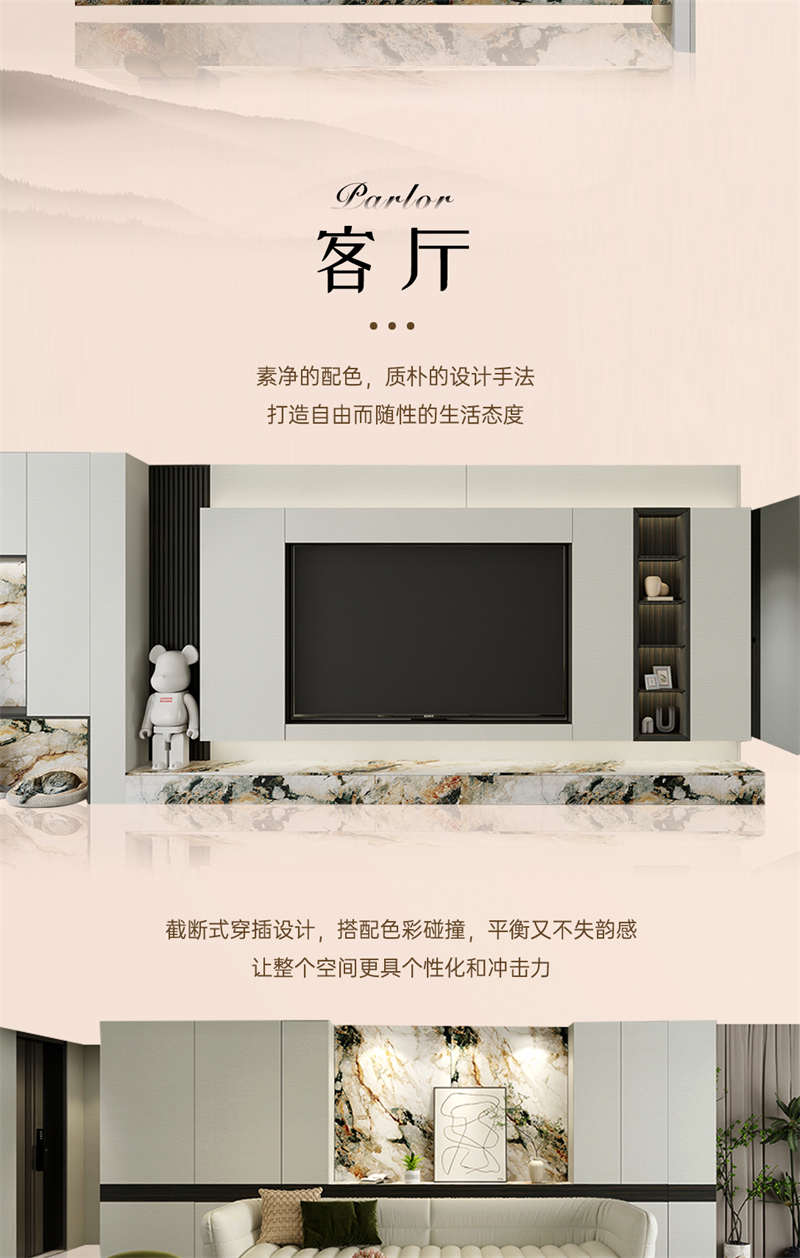 借助云水紋的元素,通過流動的線條,波動的紋理和現(xiàn)代的設(shè)計手法,打造舒適、放松、愉悅的家居氛圍。