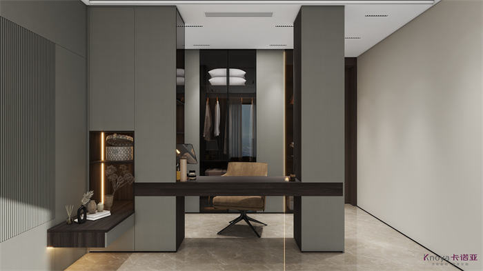 意式極簡既具有意大利文藝復(fù)興時期的意蘊(yùn),奢華高貴,同時又兼具現(xiàn)代感的干練高級,深棕色的木飾面搭配原木色穿插營造的高級感貫穿整個空間,利用材質(zhì)的對比與反差加強(qiáng)空間的質(zhì)感感受。優(yōu)雅與深邃的配色讓空間散發(fā)出靜謐感,簡約的線條在訴說永恒的經(jīng)典,脫離一切的浮華與煩躁。身居清雅地,心無車馬喧,從生活的本質(zhì)出發(fā),讓它靜下來,感受快節(jié)奏都市生活背后的安靜與寧靜。