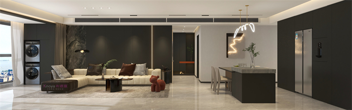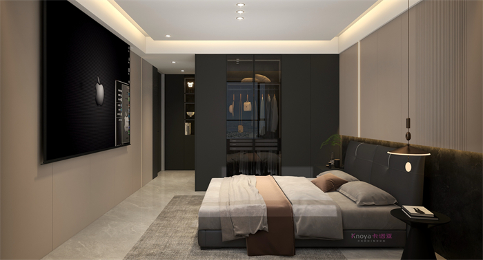 本案業(yè)主更注重與家人們的空間情感交流。戶型墻體的拆改 使布局流線更順暢,更鍥合業(yè)主的需求。玄關(guān)客餐廳采用門墻柜一體化設(shè)計,化繁為簡。鞋柜穿插式設(shè)計既有儲物功能又有美感。啞光巖板嵌入式電視背景+深色系墻板隱形門,延伸整個空間,壁爐和金屬套格更顯高級感,沉穩(wěn)大氣。內(nèi)嵌式酒柜包冰箱管線機,兼具儲物、裝飾、顏值一體。餐桌島臺做了錯位式設(shè)計,即貼合了業(yè)主的日常家居需求,又與整體空間色系相呼應(yīng)。臥室無主燈的設(shè)計還具備多種情景模式,進一步提升了臥室的氛圍體驗。
