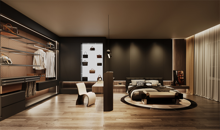 紳·逸系列設(shè)計(jì)靈感上,源于繁華都市的夜晚,低沉的色調(diào)彰顯當(dāng)代企業(yè)家“閑在臥室”的生活狀態(tài),靜謐中暗藏內(nèi)斂奢華。設(shè)計(jì)手法上,整個(gè)系列展示兩個(gè)空間(客廳、臥室),以高級(jí)灰搭配深色木紋為主基調(diào),配合流行的弧形及斜邊工藝。低調(diào)素雅的整體視覺(jué),充分詮釋意式輕奢的美學(xué)。臥室空間結(jié)合睡眠、衣帽間及輕健身功能,符合成功人士對(duì)高品質(zhì)生活和健康人生的追求。