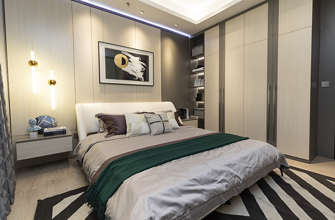 大面積運(yùn)用橄欖木+高原雪橡/印象白的撞色搭配,給人明朗、活潑、自然之感。橄欖木護(hù)墻系統(tǒng),隔音防潮,營(yíng)造舒適睡眠空間。嵌入式衣柜及推拉門(mén)設(shè)計(jì),不占用空間,將簡(jiǎn)潔風(fēng)格發(fā)揮到極致。