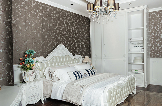 法式的優(yōu)雅與浪漫的醇白,優(yōu)美的線條搭配精致的雕花,加上隱約的銀光暗現(xiàn),渲染出一種極具藝術(shù)美感的法蘭西風(fēng)情,營(yíng)造濃郁的歐洲宮廷生活。空間以暖色為主色,床頭精致的雕花設(shè)計(jì),如藝術(shù)品般,給臥房增添精雅的裝飾效果。
