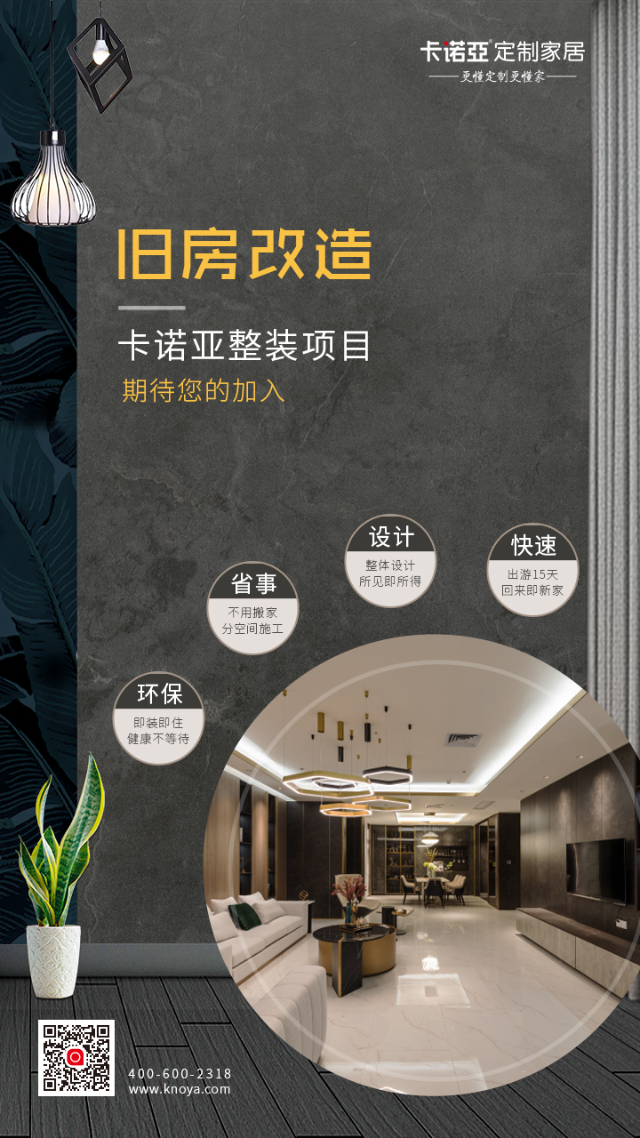 為了做到讓廣大業(yè)主在舊房改造上省錢省事,卡諾亞推出了一站式空間定制-整裝項(xiàng)目:【快速】出游15天,回來住新家;【設(shè)計(jì)】整體設(shè)計(jì),所見即所得;【省事】不用搬家,分空間施工;【環(huán)?!考囱b即住,健康不等待。