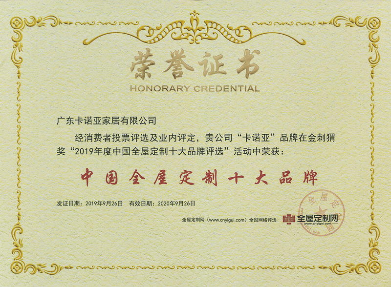 11月5日,卡諾亞榮獲金刺猬獎“中國全屋定制十大品牌”及“2019中國全屋定制最具影響力十大品牌”獎項,此次評選活動由中國建材家居行業(yè)權(quán)威媒體平臺騰王網(wǎng)絡(luò)傳媒旗下網(wǎng)站“全屋定制網(wǎng)”主辦。卡諾亞憑借專注定制家居18年的企業(yè)實力和品牌魅力,被評為“中國全屋定制十大品牌”及“2019中國全屋定制最具影響力十大品牌”獎項,創(chuàng)建于2001年、專業(yè)專注的卡諾亞獲此殊榮,可謂是實至名歸。